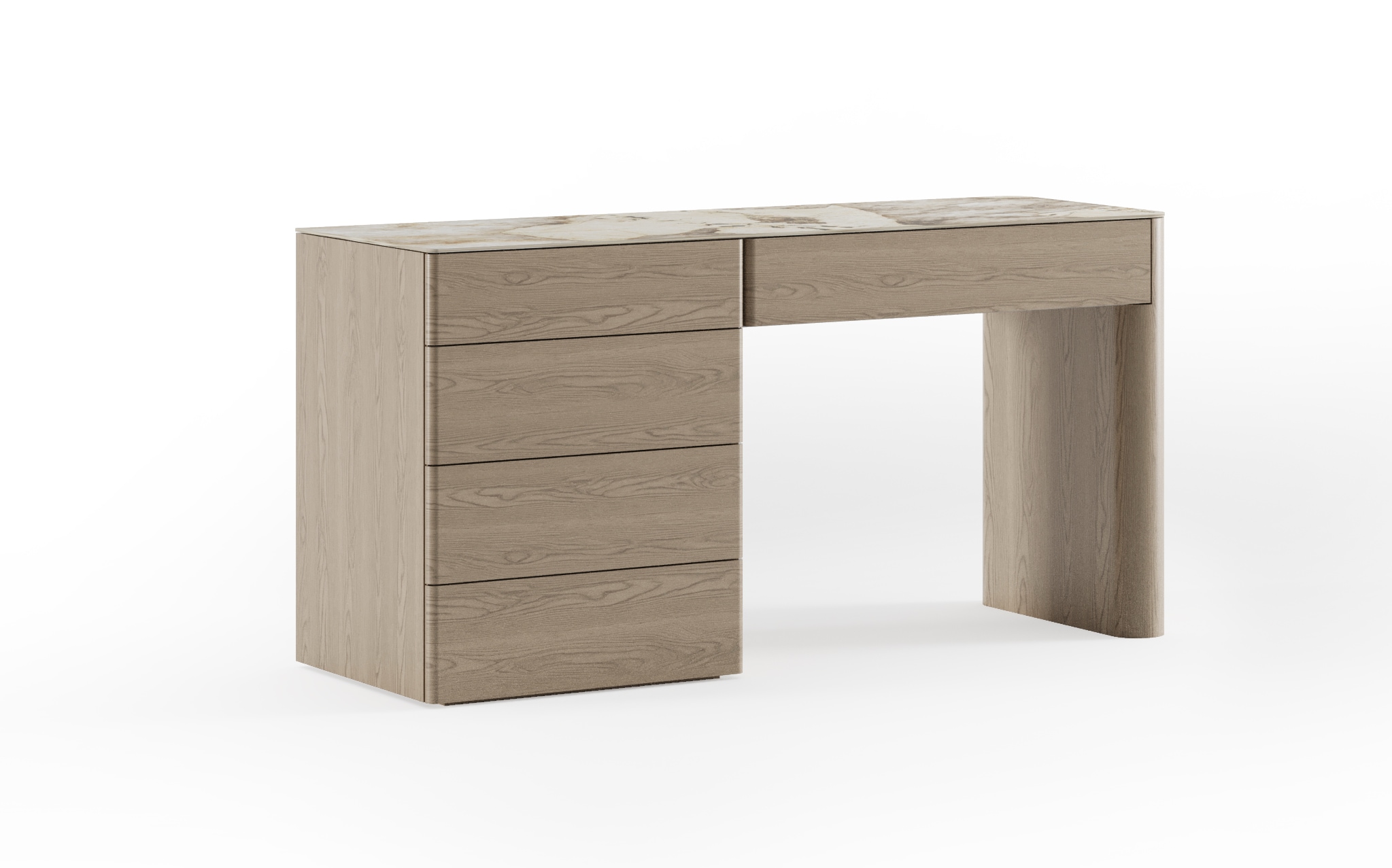 Чистые линии, тёплая древесная текстура и выверенные пропорции создают ощущение спокойной современности. Вместительные ящики скрыты за минималистичным фасадом, сохраняя визуальную лёгкость и порядок в пространстве. Столешница подчёркивает архитектурный характер модели и делает комод универсальным элементом спальни.